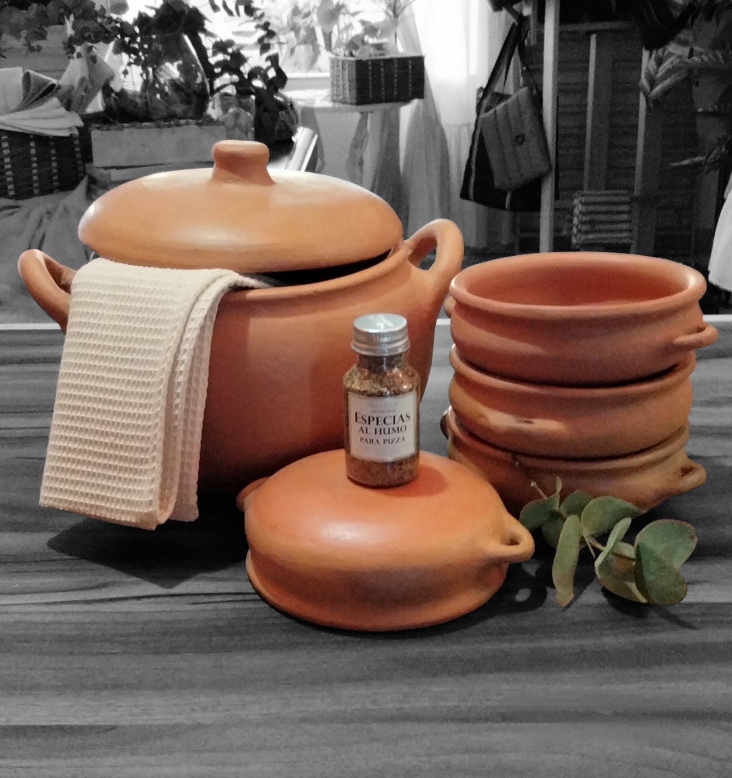 Olla de barro tipo modelo Huevo con asas y tapa, con 4 cazuelas de 12 cm de diametro. Son idóneas para la elaboración de comidas tradicionales, de una forma lenta, como los guisos con legumbres, estofados de carne y verduras.